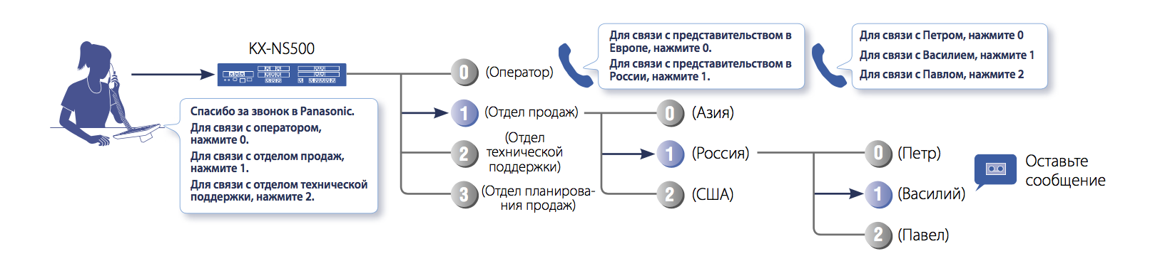 IP-АТС KX-NS500 позволяет клиентам связаться с нужным им департаментом или оператором в любой точке мира с помощью удобного голосового меню. Система также предлагает оставить сообщение для нужного сотрудника.