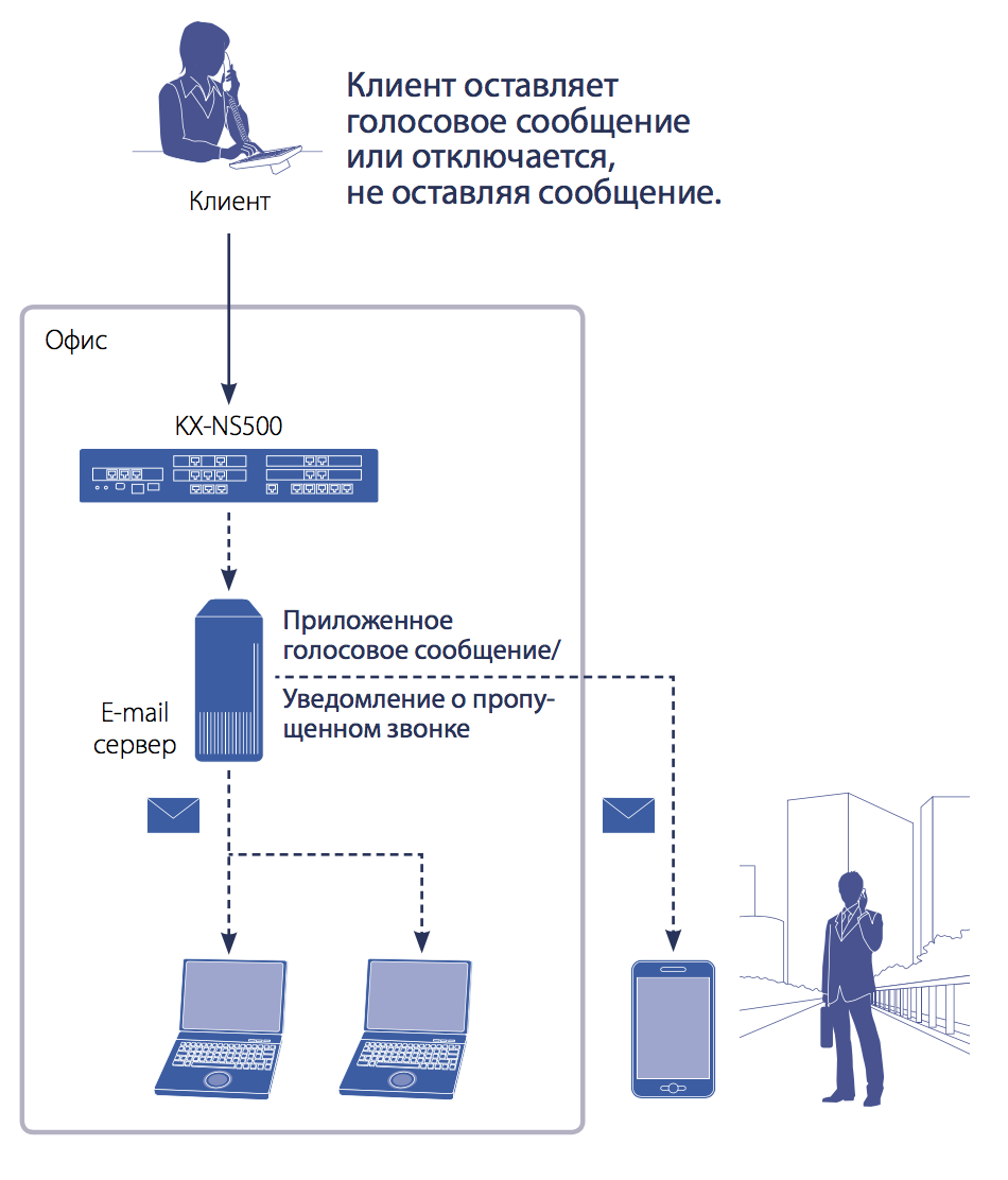 KX-NS500 посылает электронное письмо, уведомляя о получении голосовых сообщений. Сообщения могут также быть Офис получены в виде приложенного файла в письме.